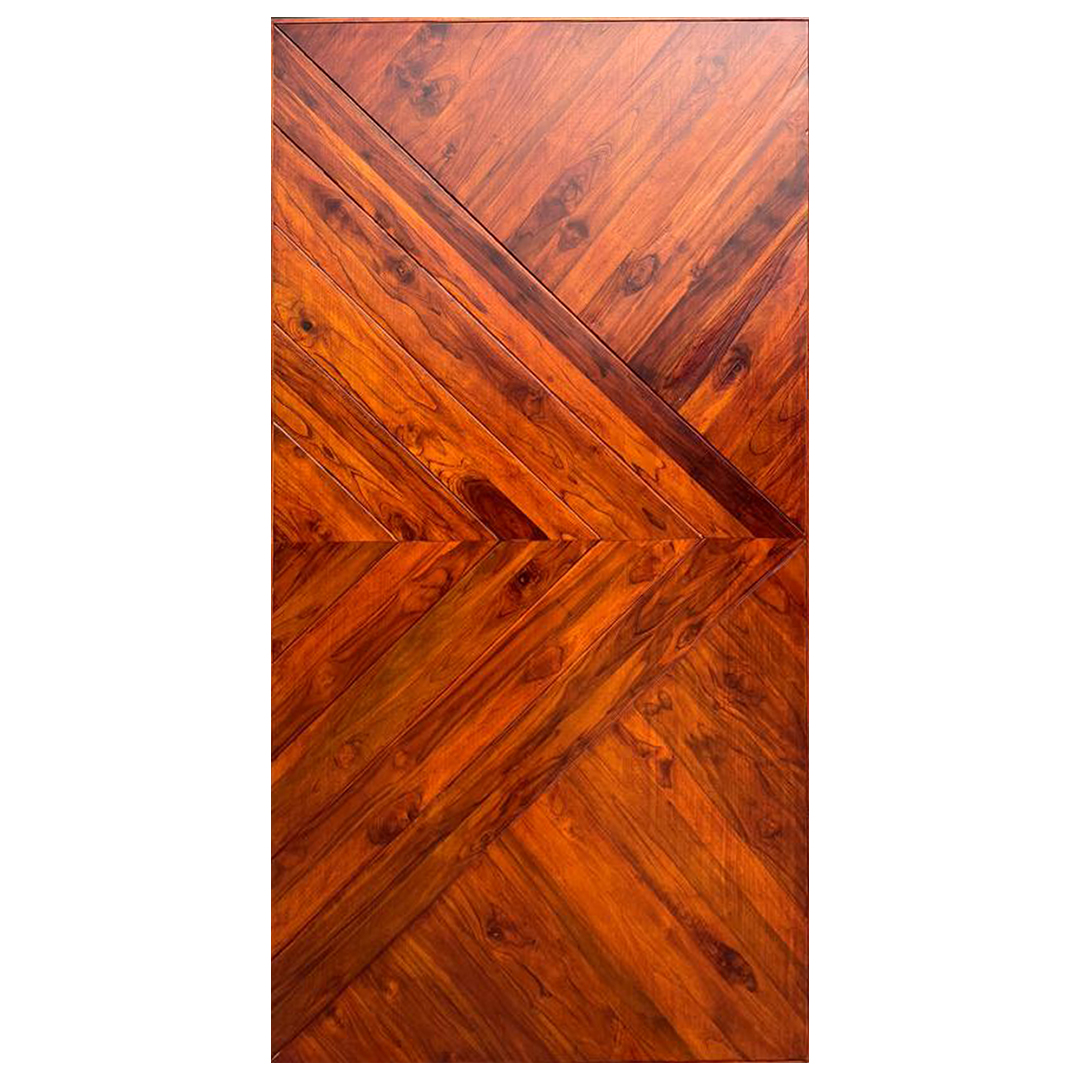 * Solid Teak Wood Strips in design format pasted on one side and matching Veneer on the other side. • Stained and Polished in PU / Acrylic.